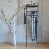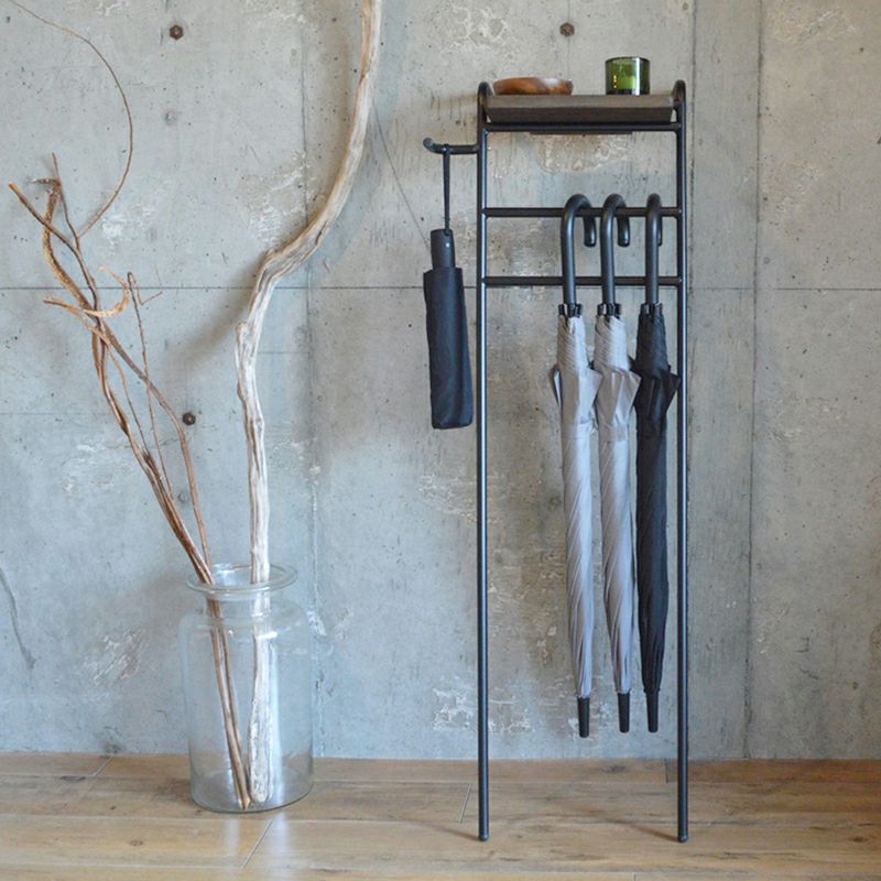 傘を吊るして収納できるおしゃれなアンブレラハンガー。 場所をとらない立て掛け式で、アーム部分には折りたたみ傘も掛けることができます。 上部にはカギなどを一時置きできる天然木のミニテーブルが付いて ブラックに粉体塗装を施した丈夫なアイアン製フレームに、ダークブラウンの天然木を組み合わせたシックでスタイリッシュなデザインでインテリアを損ないません。