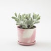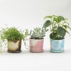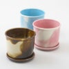 マグカップの胴体が3号ポットの植物にぴったあり合うことを偶然知ったことがきっかけとなって、底の穴を空けて受け皿をつけた、ありそうでなかった美濃焼の磁器の植木鉢です。 植物のある生活は季節の変化を敏感に感じ取り、植物の成長が暮らしに彩りを与えてくれます。植物の縁を引き立たせ、お部屋にも映えるマーブル調のブラウン、ピンク、スカイブルー の3色展開です。