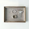 元のアイデアは古い宝飾店で使われていたトレーで、ガラスショーケースから宝石を取り出して顧客に間近で見せるためのもの。 アクセサリーなどの店舗什器として使っていただくのはもちろん、 玄関やリビングなどでアクセサリーや貴重品を置くトレーとしても使っていただけます。 ショーケースのようにきれいに置いても、少し乱雑に置いても、どちらでも様になるデザインです。