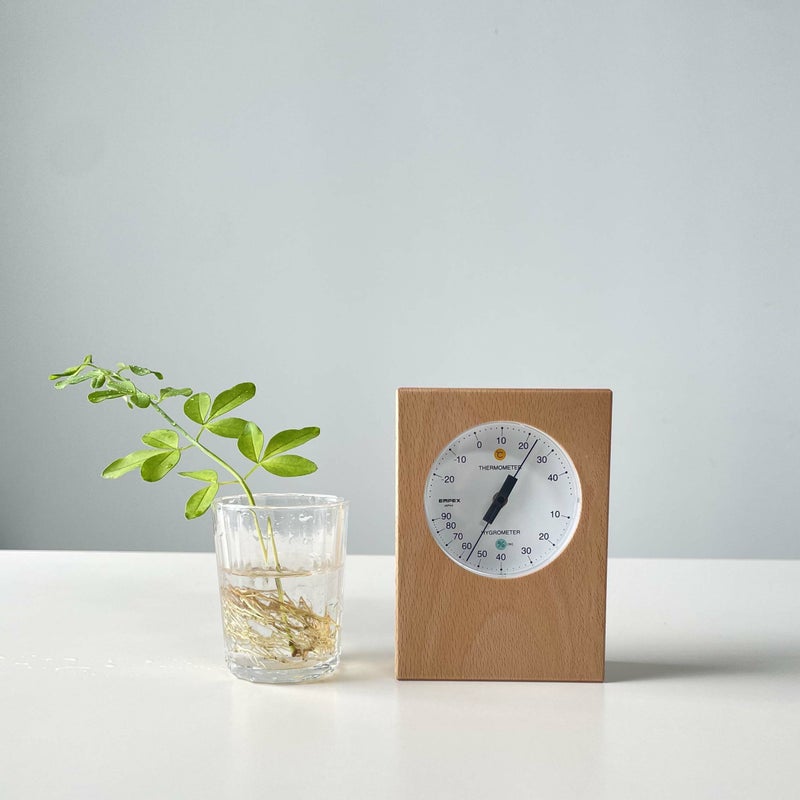 無垢のビーチ材を使用した、シンプルな佇まいの温湿度計です。 気候が安定せず時期外れの暑さや寒さが多くなった近年、 気軽にお部屋の温度・湿度が管理しやすいよう作られました。 裏面に壁掛け用のひっかけ穴があるので 置いておくのはもちろん、壁掛けでも使用できます。 お部屋に木のぬくもりをプラスしてくれる、 インテリアにもピッタリの実用的な温湿度計です。 1973年創業の家庭用温度計、湿度計、気圧計専門メーカーである エンペックス気象計株式会社の国内製温湿度計を採用しています。
